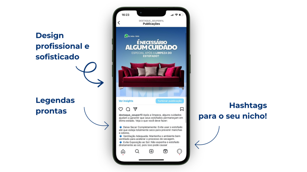 Você não precisa se preocupar com nada além de baixar o material e postar no seu Instagram, já que todos os posts já estão com conteúdo direcionado, LEGENDA PRONTA e até hashtags para atrair público interessado nos seus serviços!